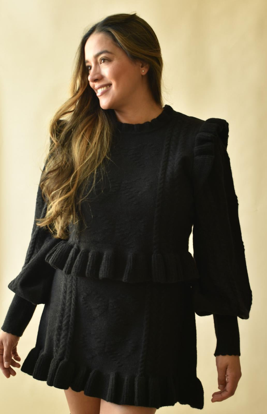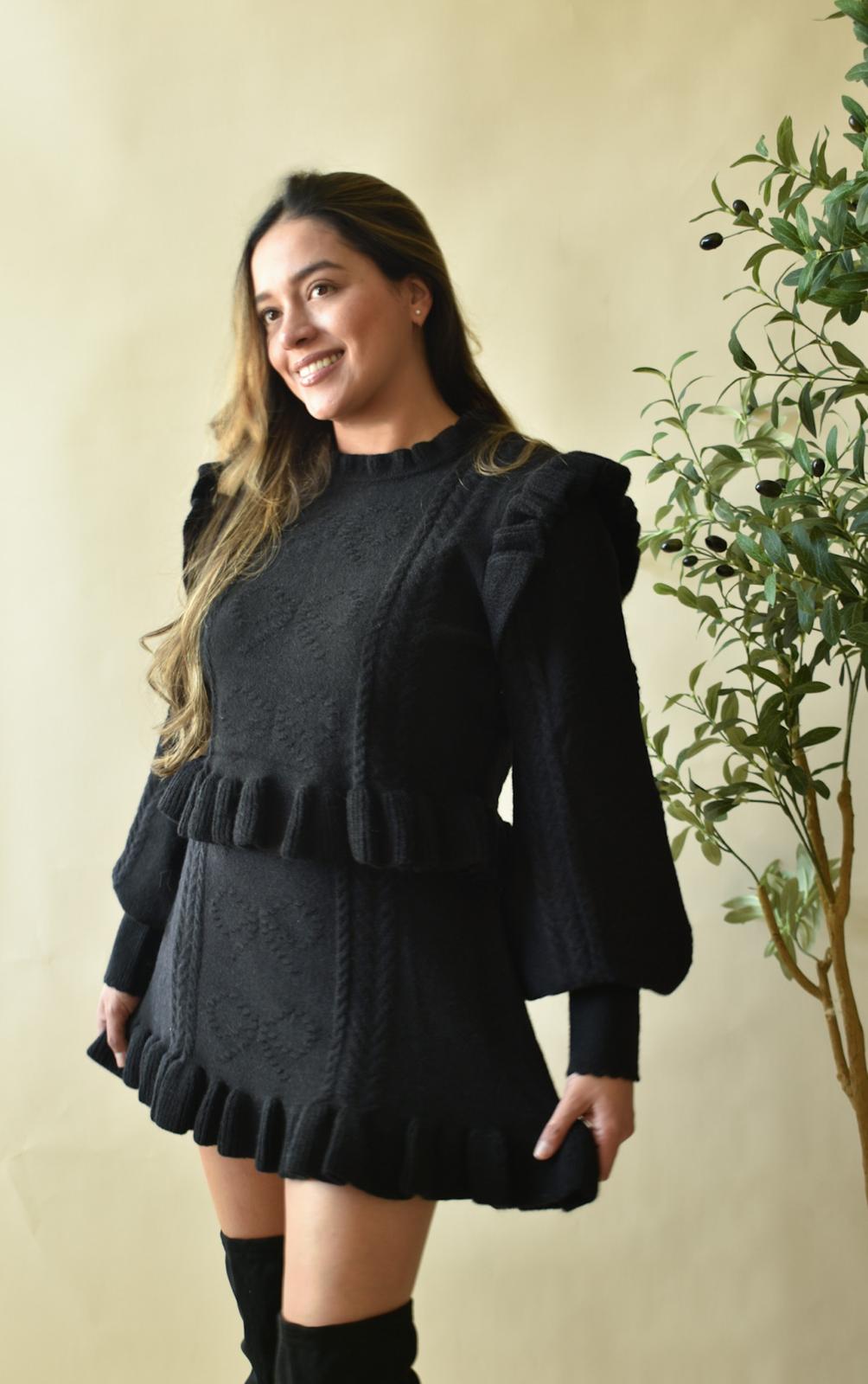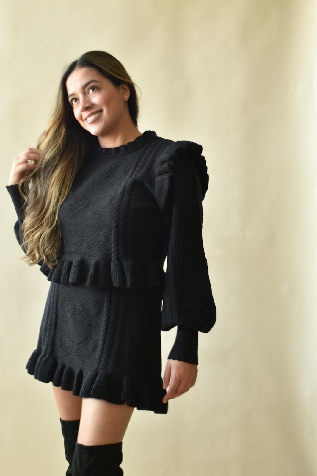 LONG SLEEVE BOW RIBBON KNIT RUFFLE CROPTOP AND MATCHING MINI SKIRT