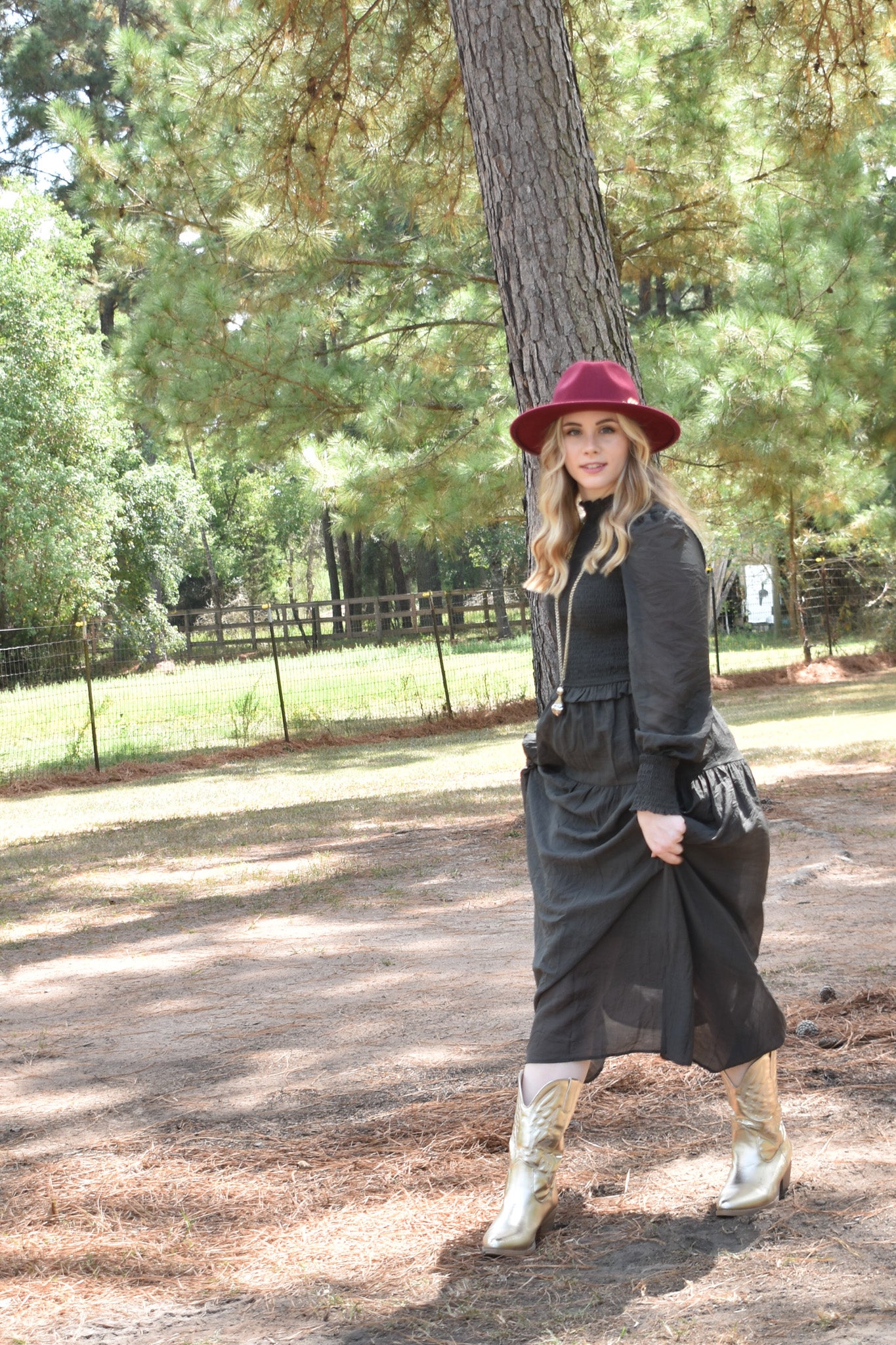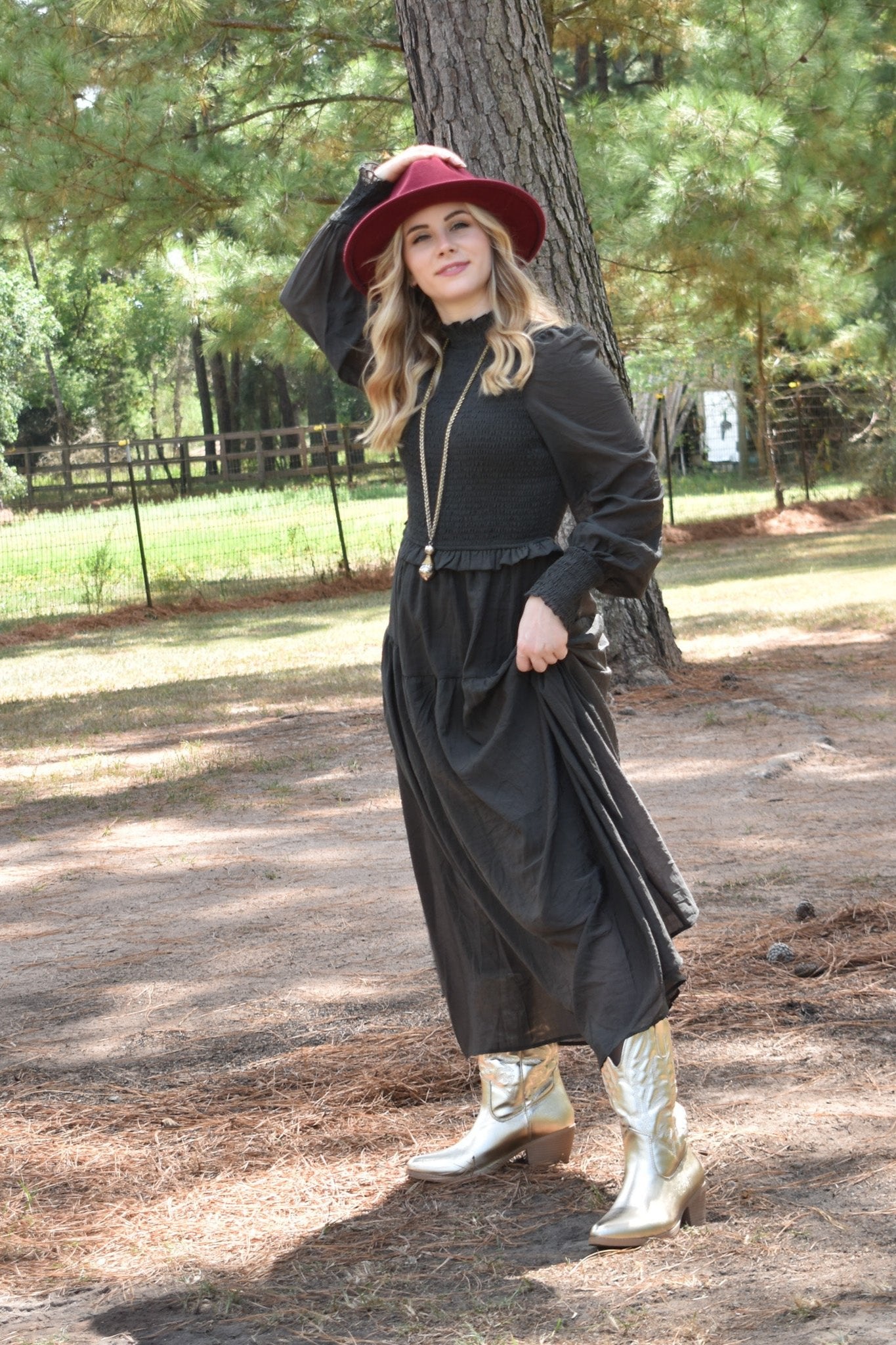 CHARCORAL LONG SLEEVE RUFFLE MAXI DRESS