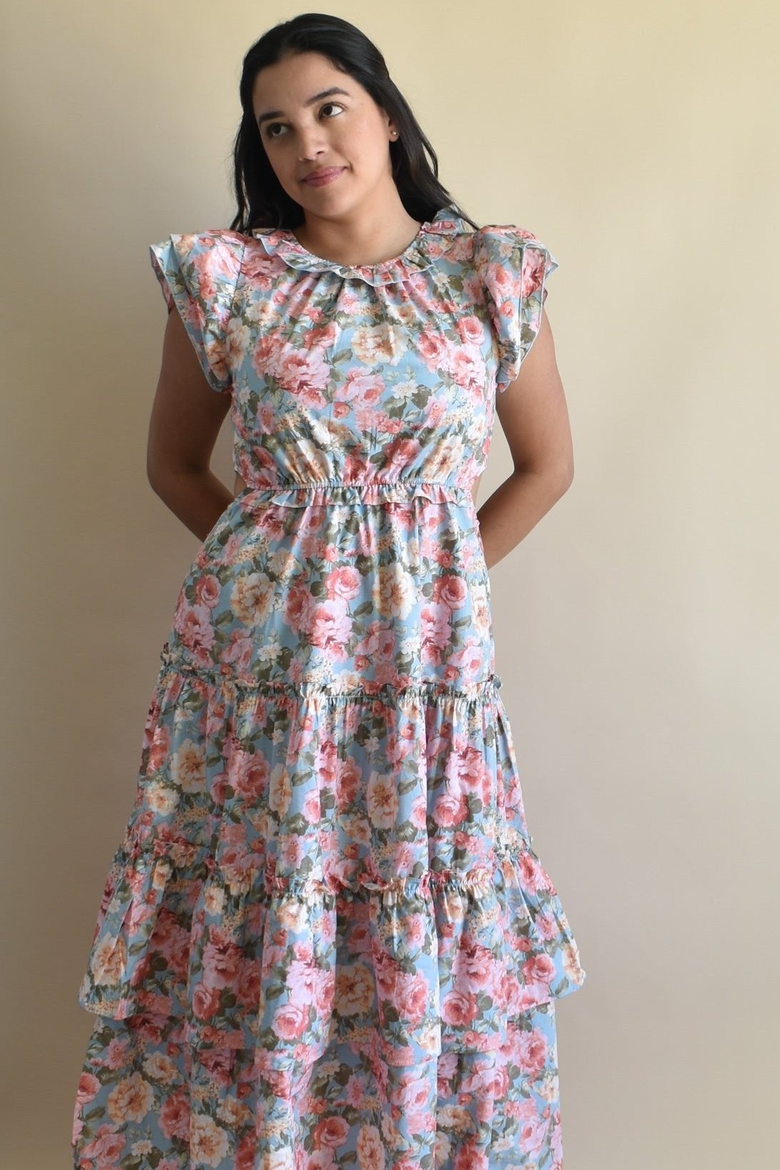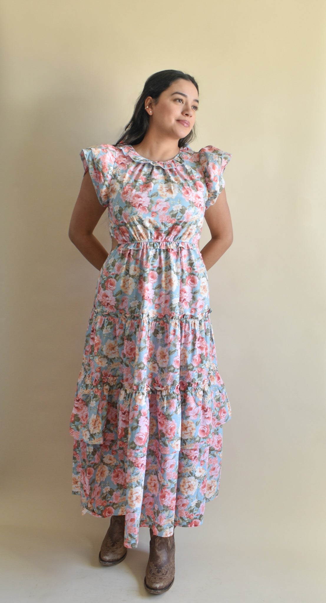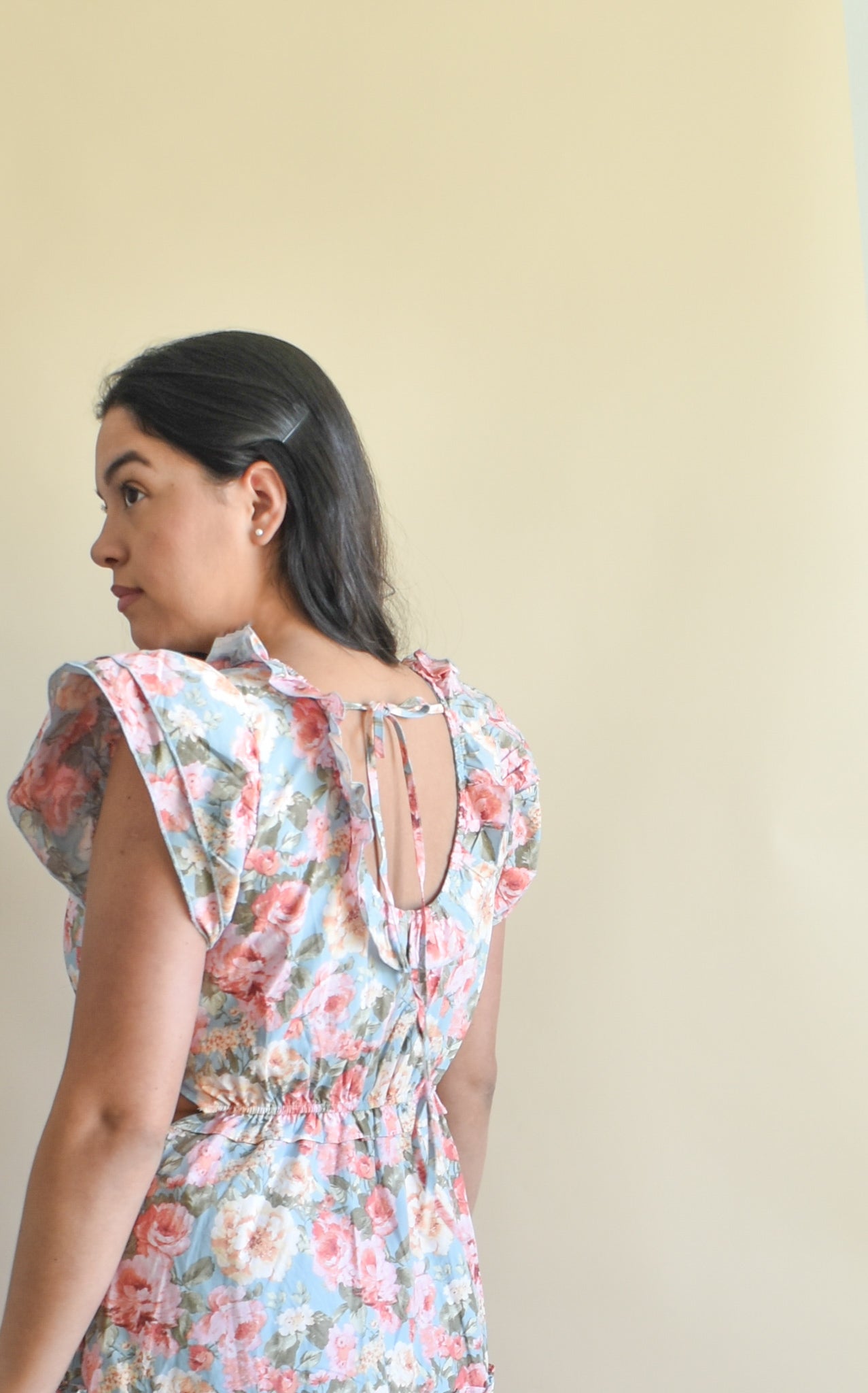 VINTAGE BLUE FLORAL PRINT RUFFLE SIDE CUTOUT MAXI DRESS