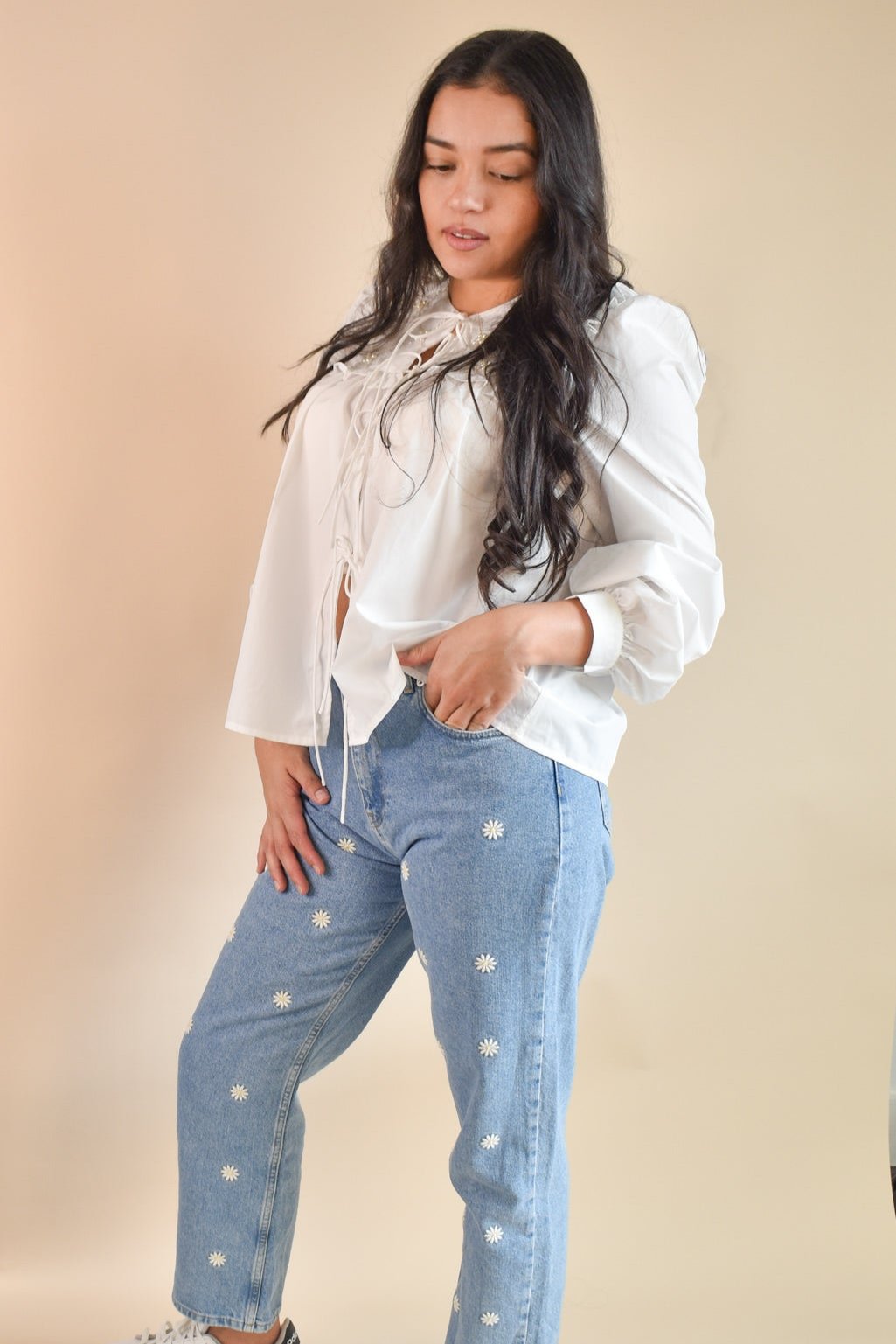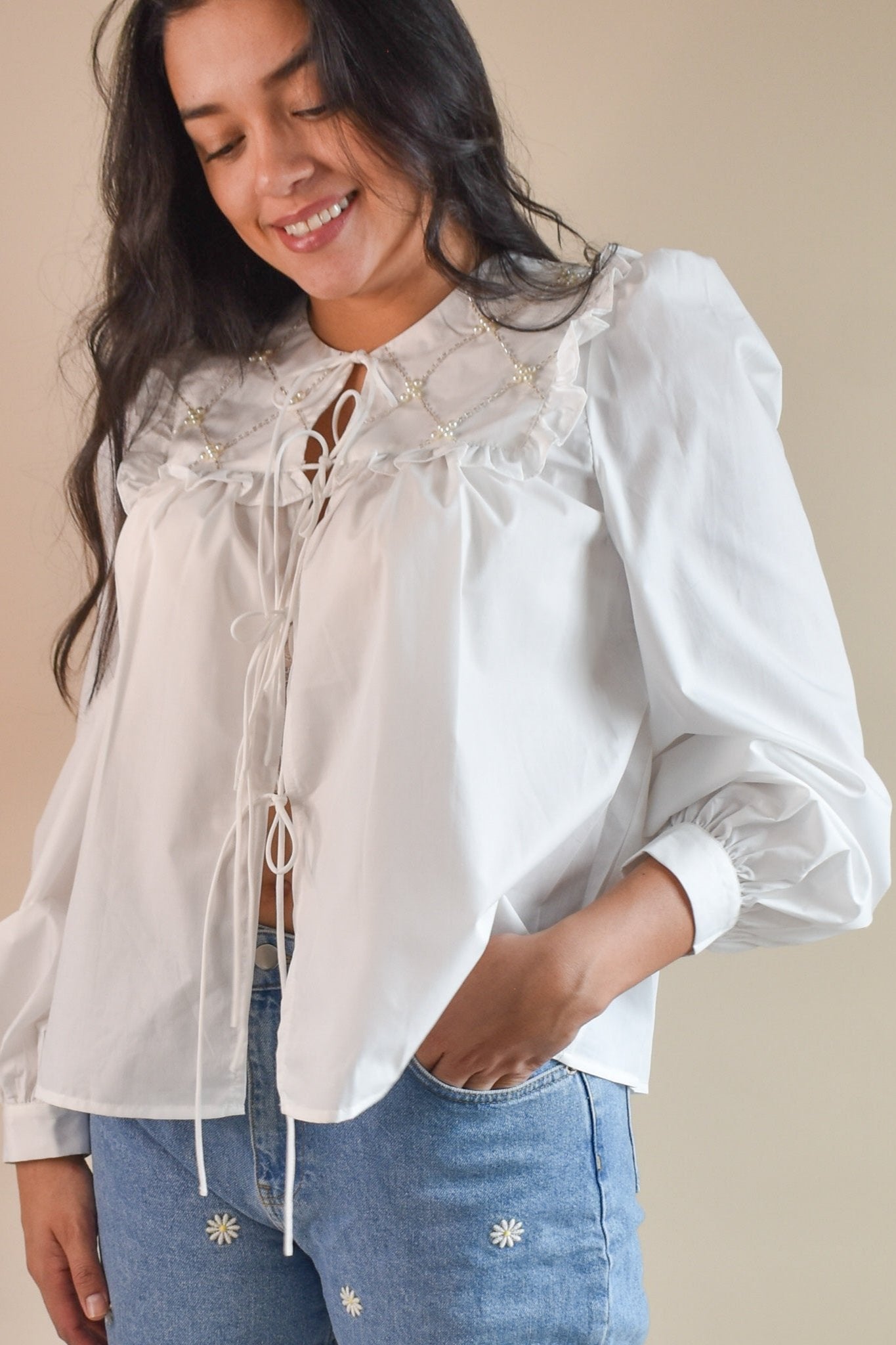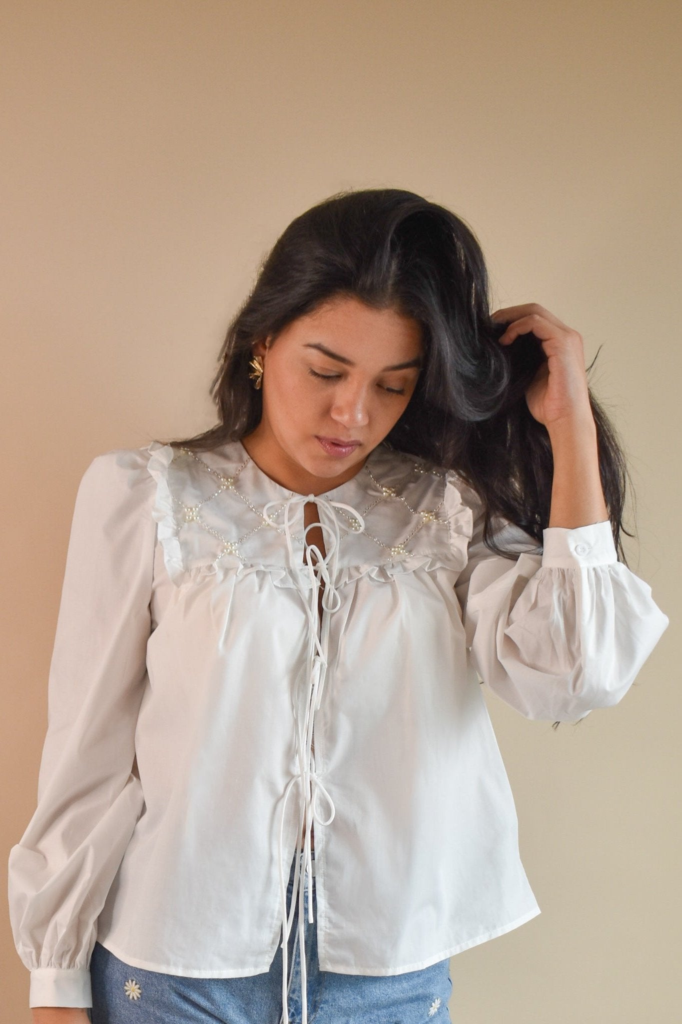 OFF WHITE BEADS EMBELLISHED RUFFLED BLOUSE