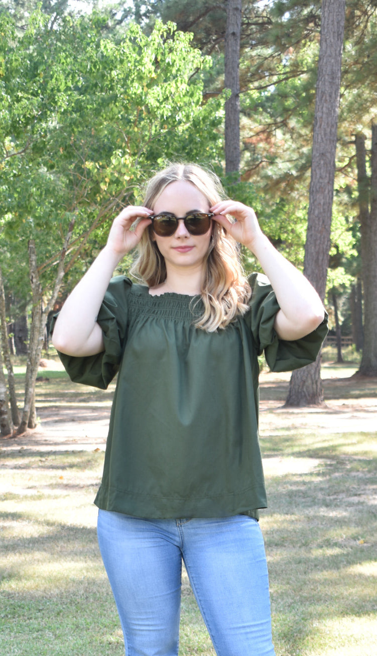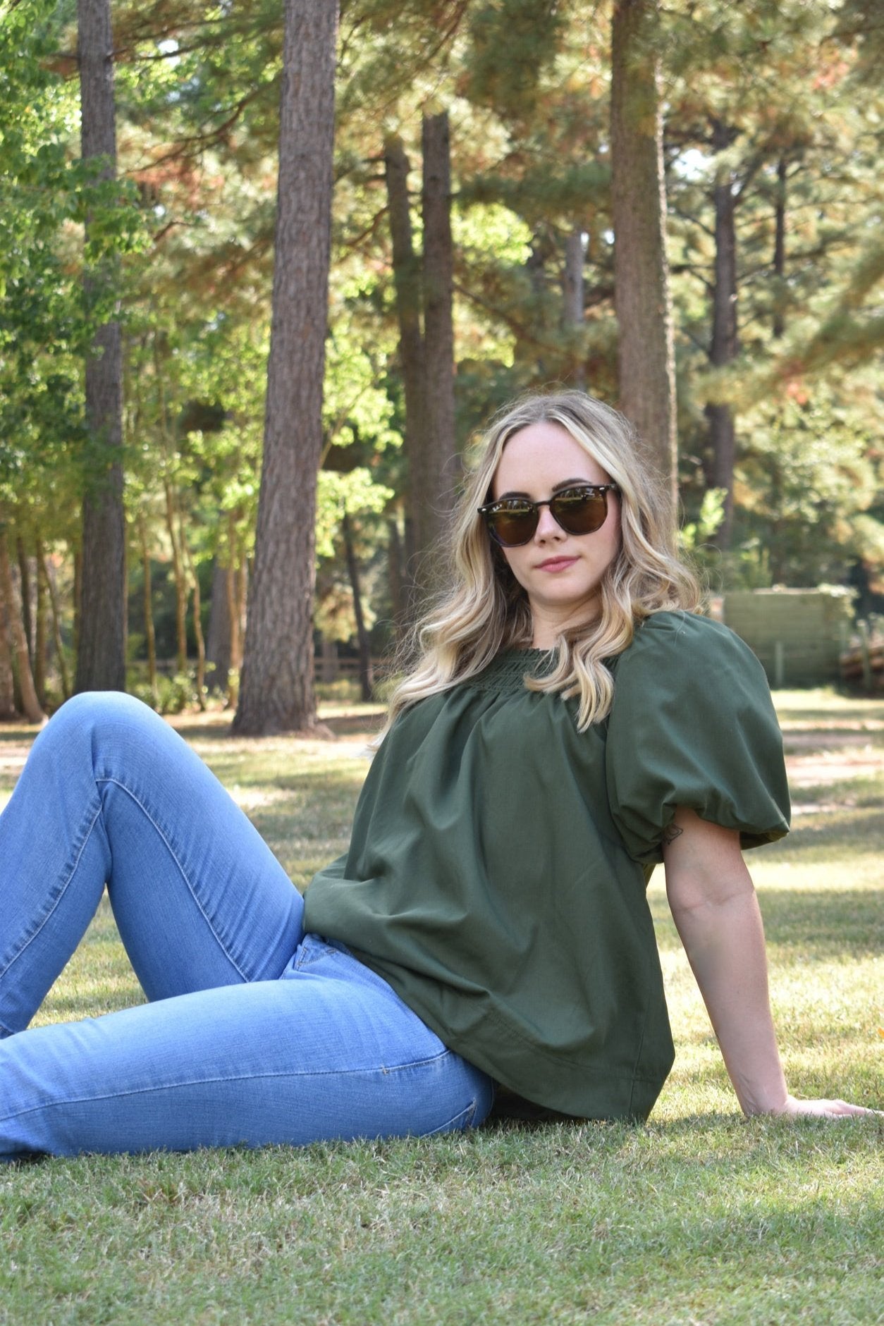 HUNTER GREEN 100% COTTON SHORT PUFF SLEEVE TOP